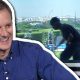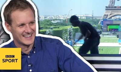A workman casually strolls into shot during filming of Football Focus at the BBC’s Euro 2016 studio in Paris. This is from our series of clips,...
